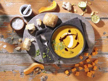 Möhrencremesuppe mit Avocado-Kokosnuss-Topping