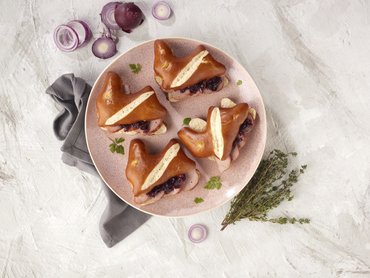 Mini-Leberkäse mit Zwiebelconfit und Laugenhäschen