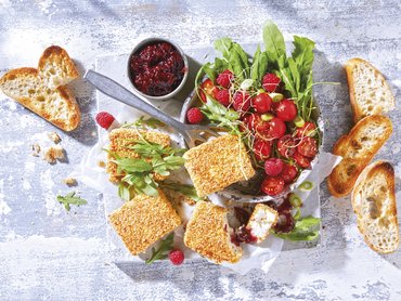 Überbackener Schafskäse mit Himbeer-Rosen-Fruchtaufstrich