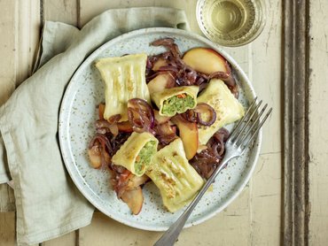 Gorgonzola-Birnen-Ravioli mit karamellisierten Birnen und Rieslingsauce (von Johann Lafer)