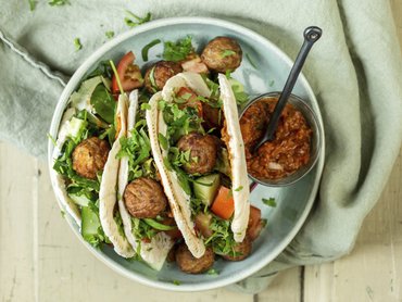 Vegetarische kein-Hack Frikadellen Spieße mit Granatapfel-Salsa