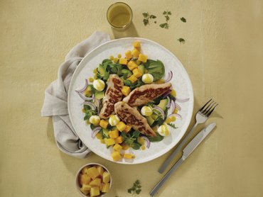 Mango-Avocado-Salat mit Hähnchen-Filetspitzen und Mozzarella