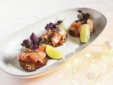 Röstinchen mit Räucherlachs, Crème fraîche und Dill